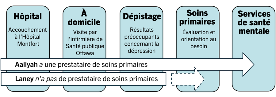 Les résultats du dépistage de la dépression chez Aaliyah et Laney sont préoccupants, ce qui signifie que l’infirmière a maintenant la responsabilité d’assurer un suivi approprié (Waqas et coll., 2022). Aaliyah a une prestataire de soins primaires. L’infirmière envoie ses résultats à la prestataire, en demandant une évaluation médicale et une orientation vers des services de santé mentale en cas de besoin. Grâce à ce soutien, Aaliyah reçoit des soins et son état finit par s’améliorer. Pendant ce temps, Laney n’a pas de prestataire de soins primaires (que l’on qualifie aussi de patiente orpheline). Étant donné que ses résultats n’aboutissent nulle part, Laney doit se présenter elle-même à un service d’urgence ou à une clinique sans rendez-vous, où elle est confrontée à une mauvaise continuité des soins et à des circonstances imprévisibles telles que de longs temps d’attente (Bull et coll., 2021).