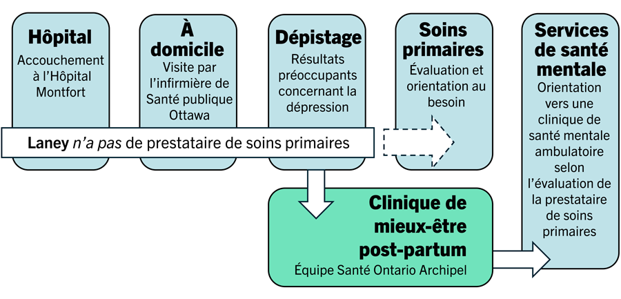 En se concentrant sur cinq objectifs (voir Nundy et coll., 2022), l’AIIAO a élaboré le programme de désignation des BPSO (Best Practice Spotlight Organizations), qui favorise les partenariats avec des organisations pour mettre en œuvre leurs lignes directrices sur les pratiques exemplaires. La Clinique de mieux-être post-partum de l’Équipe Santé Archipel Ontario a été créée à l’Hôpital Montfort pour des femmes comme Laney (figure 2, appuyée par les lignes directrices Soins axés sur les besoins de la personne et de la famille de l’AIIAO, 2015).
